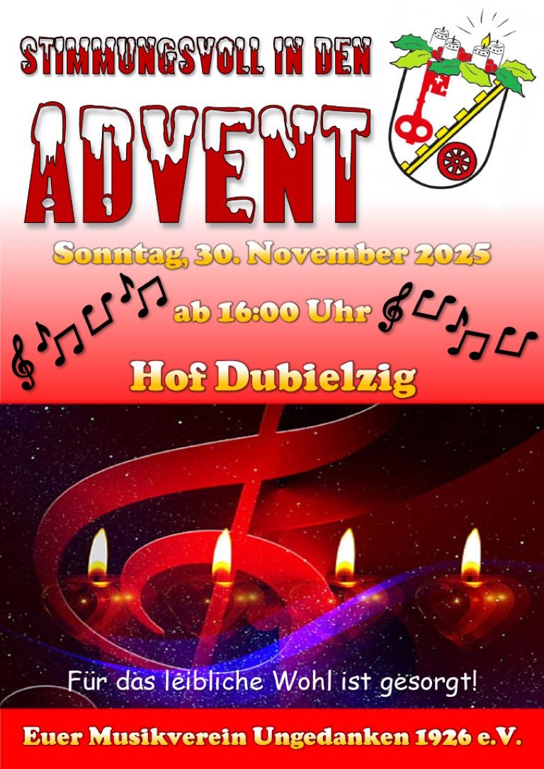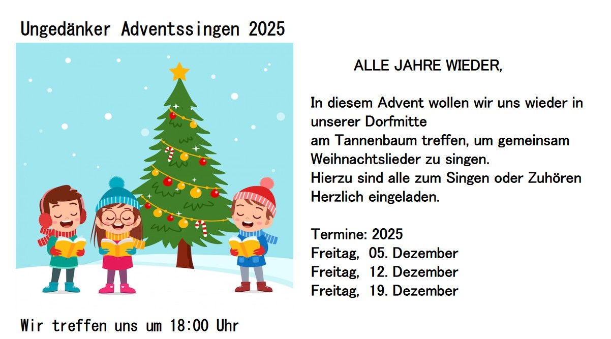 Wir möchten mit Musik für vorweihnachtliche Stimmung in Ungedanken sorgen. Am 1. Adventssonntag den 30.11.2025 laden wir dazu ein.