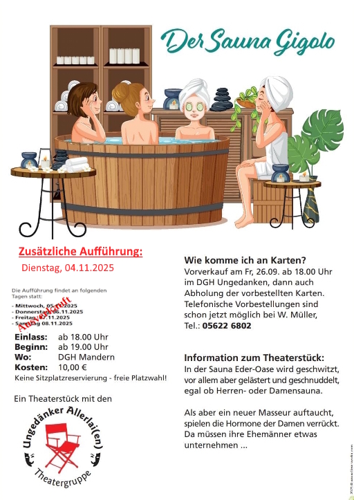 05.,06., 07. u. Aufführung der Theatergruppe Ungedänker Allerlaien "Der Sauna Gigolo" (siehe unten)