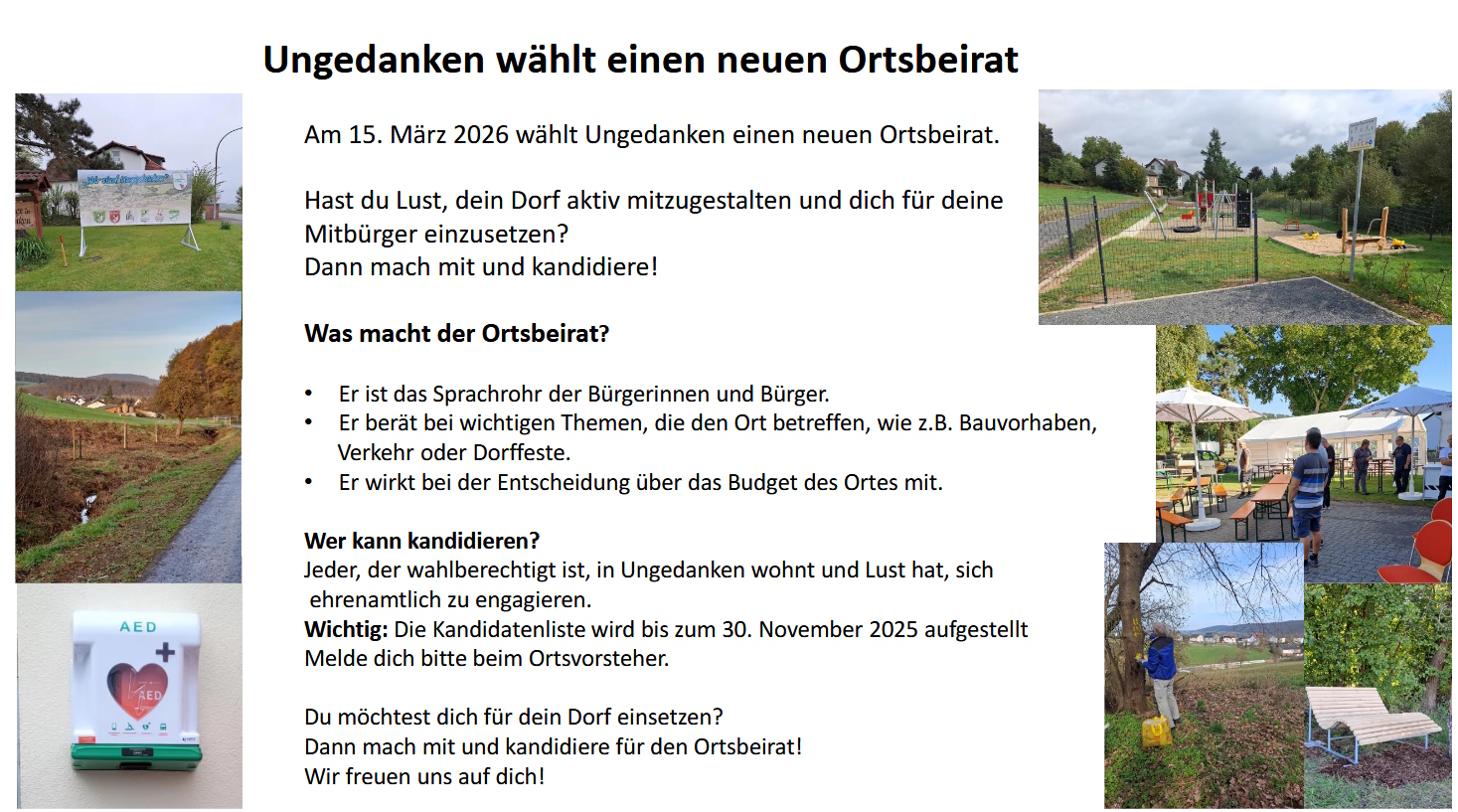 Für die Besetzung des neuen Ortsbeirates ab März 2026 suchen wir engagierte Mitbürger/innen, die sich für unseren Ort ehrenamtlich einsetzen. Am 21.10 2025 um 19:30 Uhr findet daher eine öffentliche Sitzung zur Aufstellung der Wahlliste im Multifunktionshaus statt. Wir würden uns freuen, wenn möglichst viele Mitbürger/innen daran Interesse hätten und sich vielleicht schon vorher beim Ortsvorsteher oder den Ortsbeiratsmitgliedern melden würden.